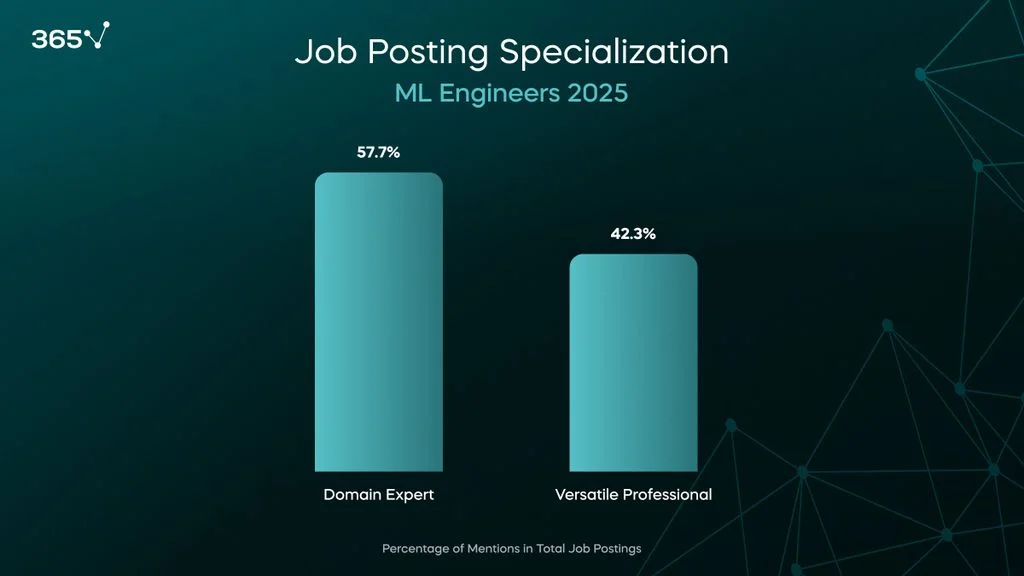 Among all our job market research for 2025, ML engineers showed the closest split between Domain Experts and Versatile Professionals—58% and 42%, respectively.
