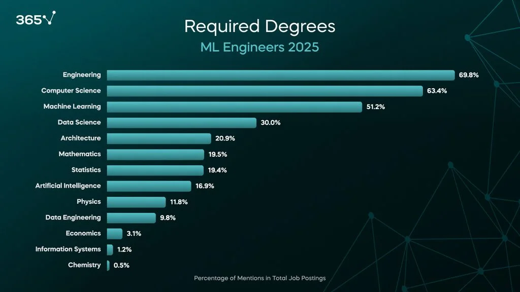 The most in-demand degrees are engineering, computer science, and machine learning, with each of these qualifications mentioned in more than 50% of job listings.