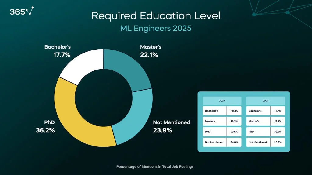 These figures have remained virtually unchanged from our 2024 ML engineer job market research, suggesting that educational requirements for machine learning engineers have stabilized as the industry matures.