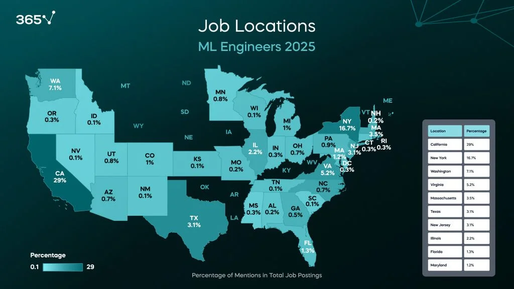 When it comes to ML engineering jobs in 2025, California remains the undisputed leader. With 29% of all job postings, the state continues to be the epicenter of machine learning innovation and development.