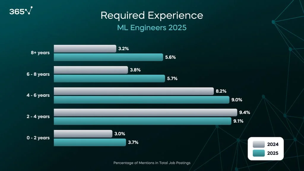 In 2025, most ML engineering roles target professionals with 2–6 years of experience, accounting for about 18% of job postings.