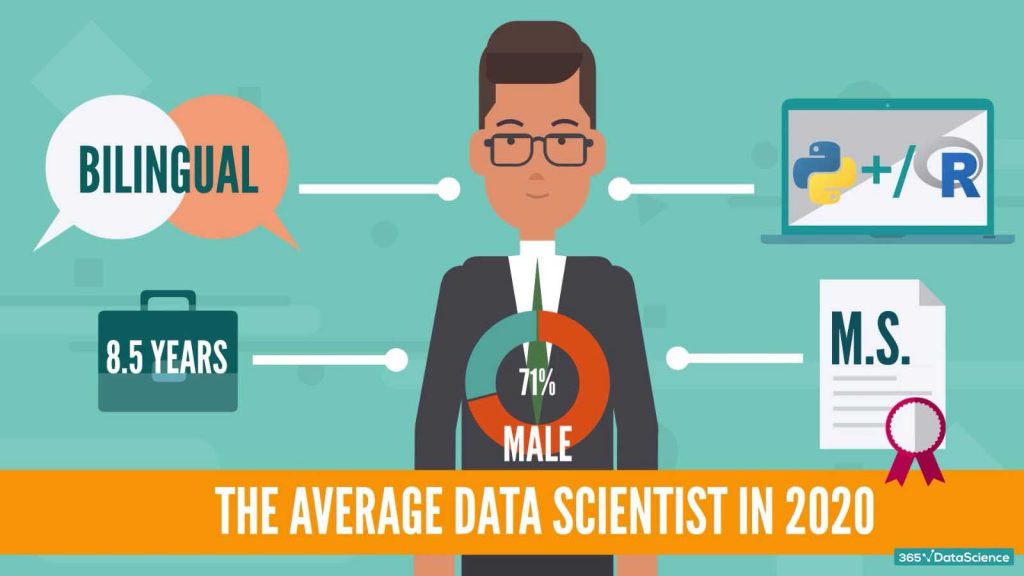 In 2020, our study portrays a data scientist’s collective image as a male (71%), who is bilingual, has been in the workforce for 8.5 years (3.5 years of which has worked as a data scientist). He or she works with Python and/or R and has a Master’s degree.