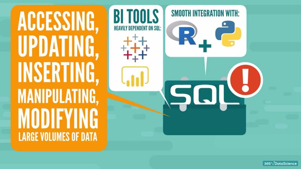 Today’s businesses create quintillion bytes of data on a daily basis. That makes SQL a super-important tool in a data scientist’s toolbox since it is critical in accessing, updating, inserting, manipulating, and modifying large volumes of data. It also integrates smoothly with other scripting languages like R and Python. Besides, BI tools such as Tableau and Power BI are heavily dependent on it, thus increasing its adoption.