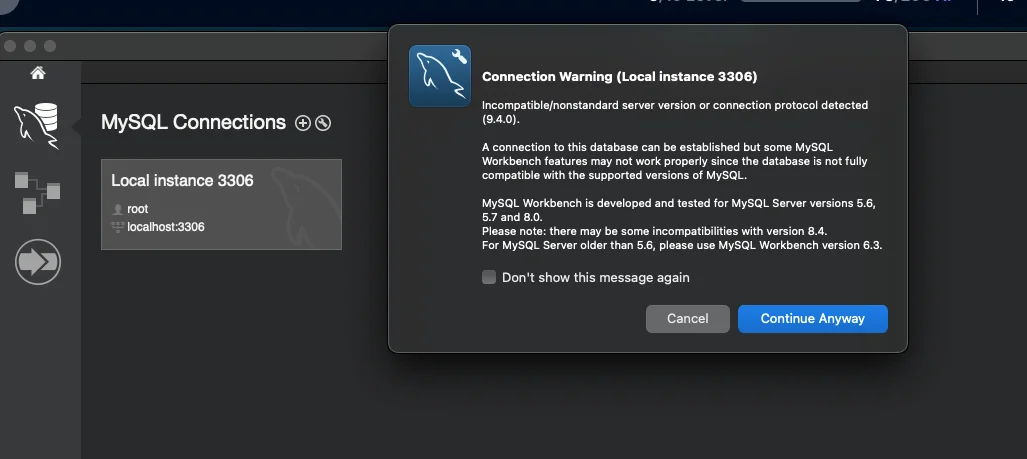 - The warning might be related to the MySQL version or compatibility issue with the Workbench version. Ensure that MySQL server and Workbench are compatible. Since you mentioned using an archive version, it might not fully support newer features.