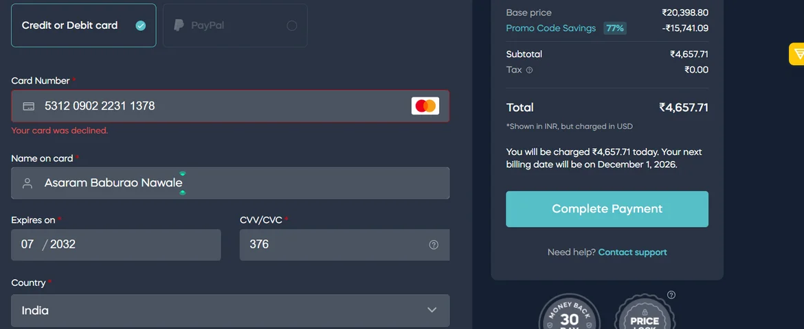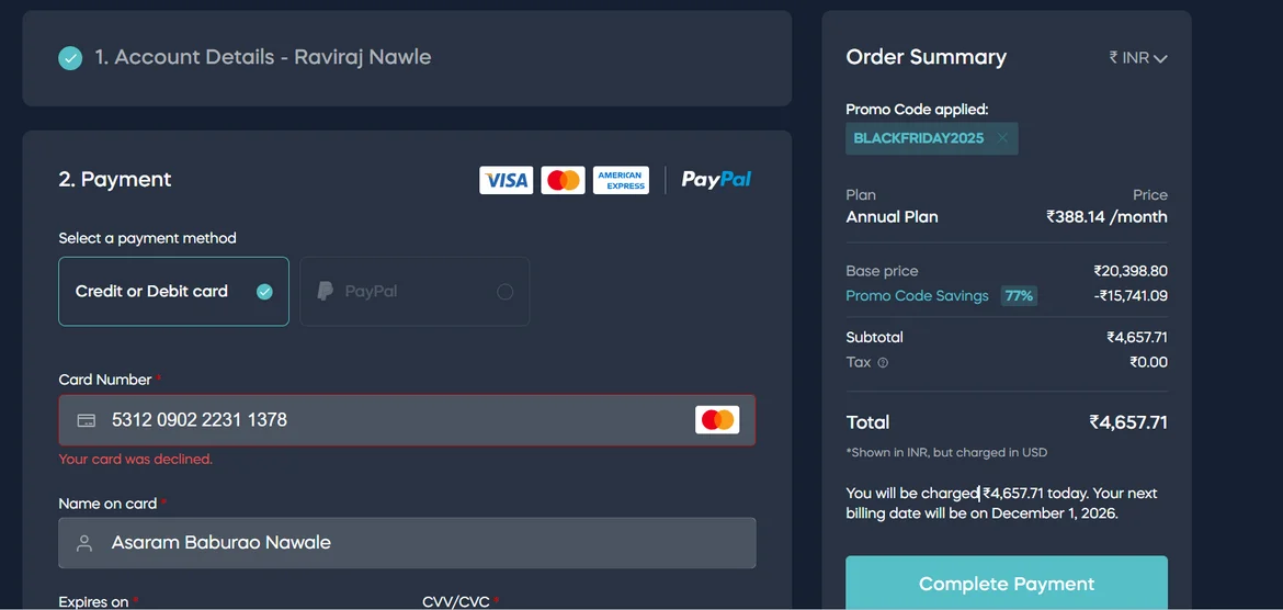 I am unable to make the payment for the annual subscription to the platform. It displays "Your Card was declined." I am attaching a screenshot of the issue. I kindly request that my issue be resolved as soon as possible.