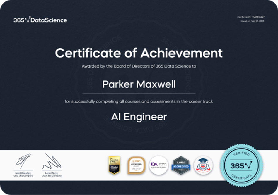 365 Data Science Career Track Certificate shows you’ve built role-relevant skills and passed rigorous exams on an accredited learning platform.