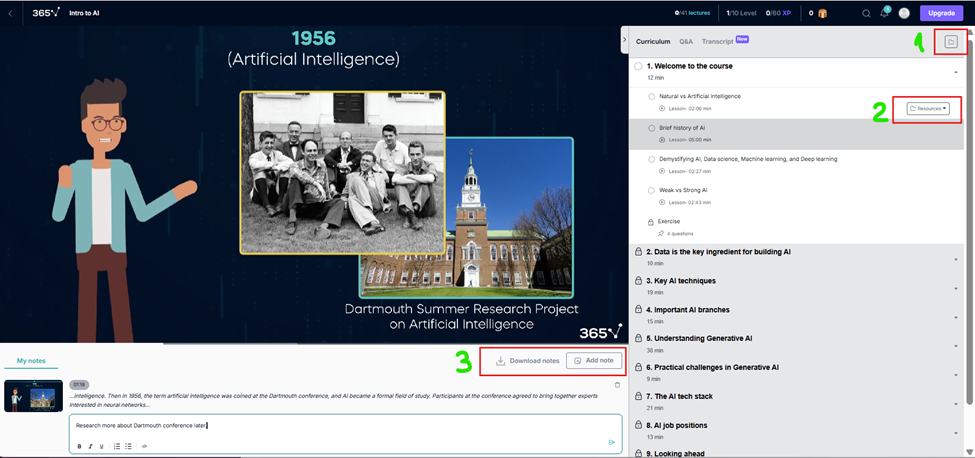 - Notes: While watching a lesson, you can add a note tied to a specific timestamp. Your notes appear in your My notes area under the video, where you can also add extra thoughts as follow-up comments.