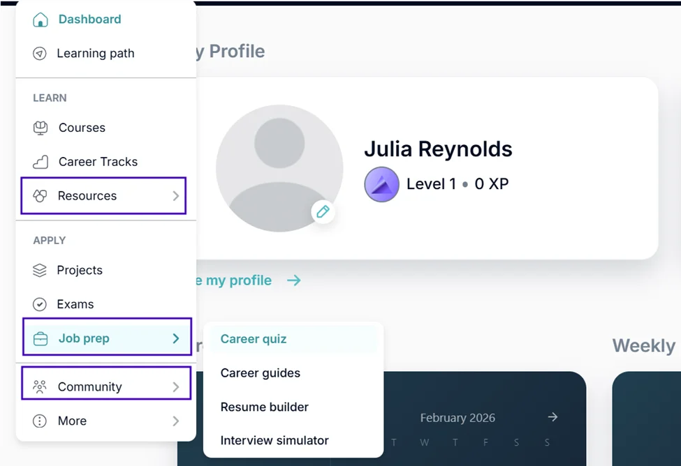 Once you’re inside, it’s not just courses. There are a few built-in tools that make learning easier to stick with and connect it to job prep. Here’s what you’ll actually notice and use.