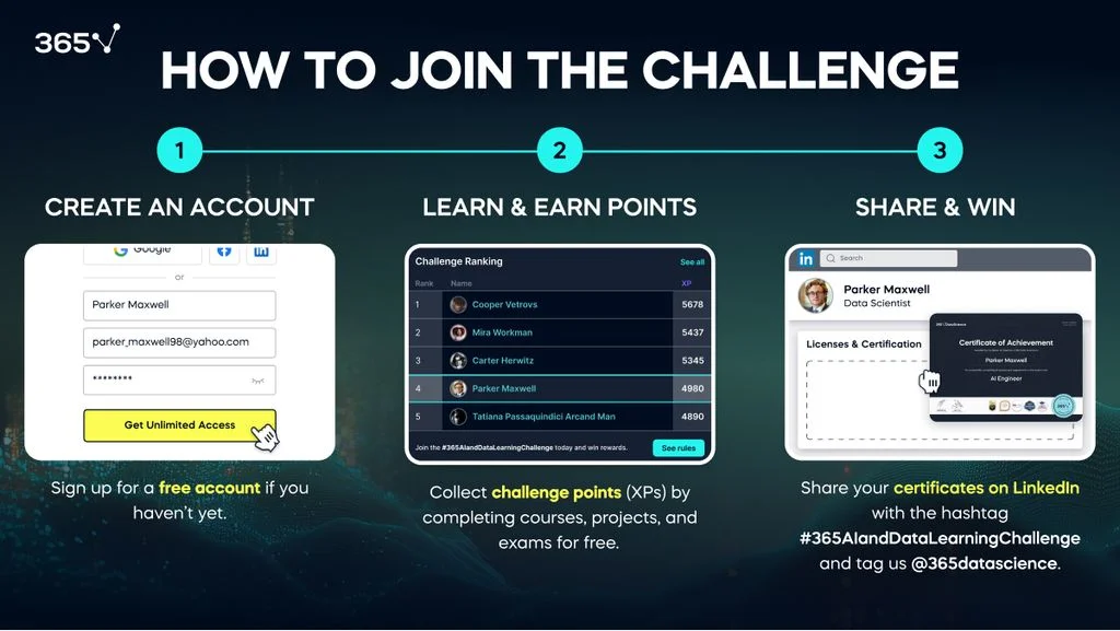 - Share your earned certificates on LinkedIn using the hashtag #365AIandDataLearningChallenge and tag @365DataScience.