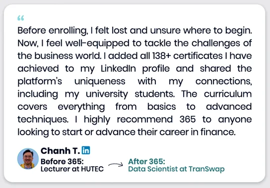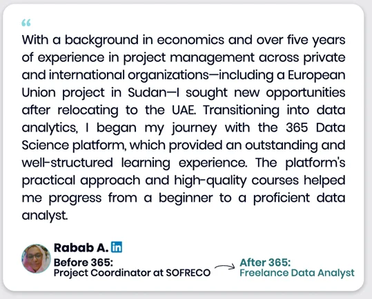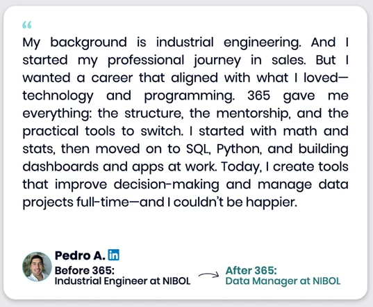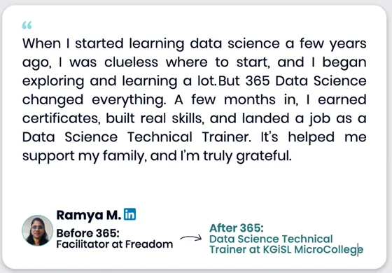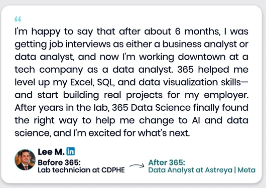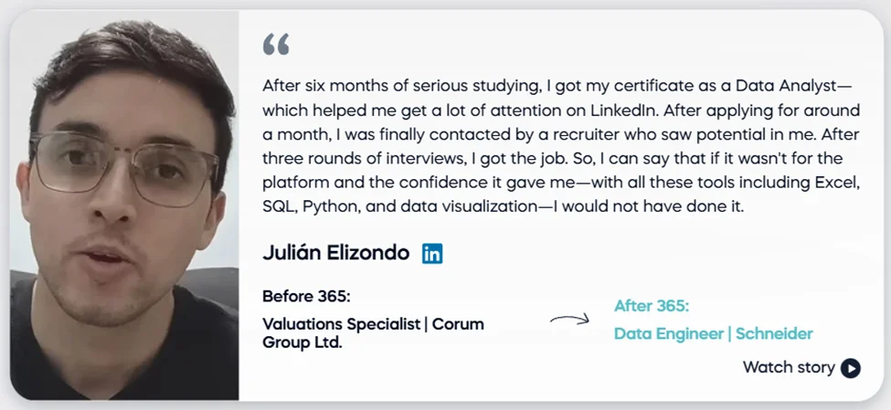 Our learners use 365 to build practical AI & data skills—and many go on to work in data-driven roles at well-known companies across tech, finance, healthcare, telecom, consulting, and more.