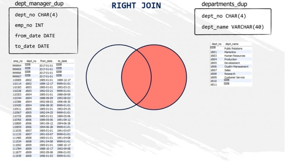 The shared area between the two circles, filled with red, represents all records that belong to both the “dept_manager_dup” and the “departments_dup” tables. We also call this area a result set.