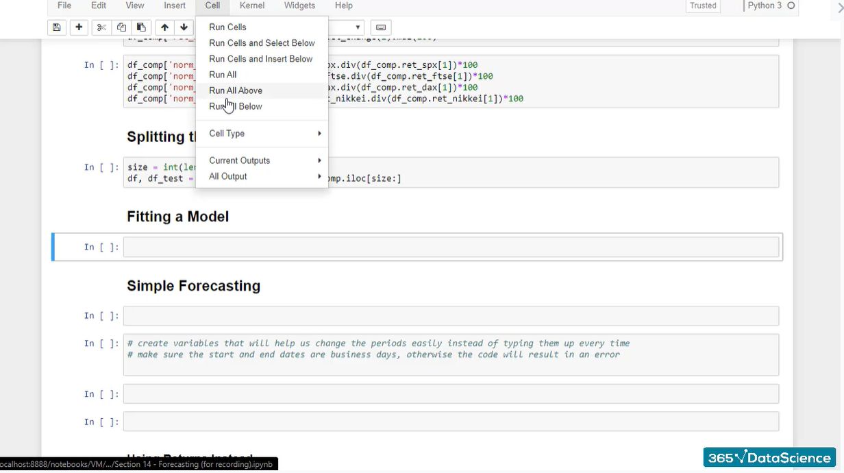 The first bit of coding we need to do ourselves involves fitting the model. As we mentioned earlier, we’re going to start with a simple autoregressive model and see how predictions evolve over time. We can name the variable model_ar: